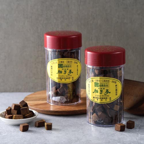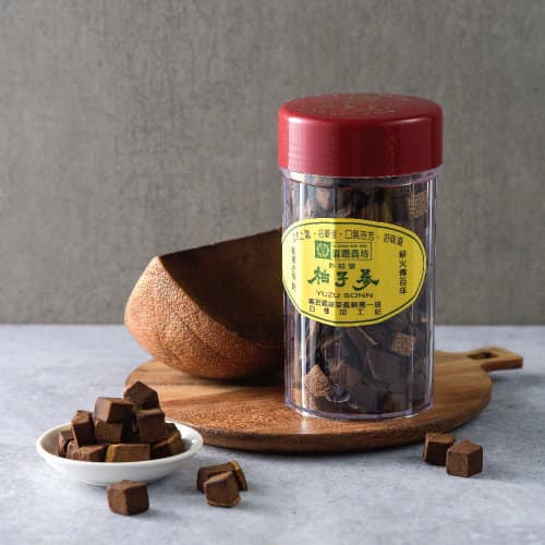 「柚子蔘」一般放一年以上、外皮黑色的,就可稱為陳年柚子蔘,是古早味的喉糖,在以前醫藥不發達的時代,喉嚨不舒服或受風寒,食用切成塊狀的柚子蔘,可幫助舒緩,搭車出遠門,以前飲料販賣沒有現在這麼方便,隨身攜帶幾片柚子蔘,含在嘴裡生津止渴。